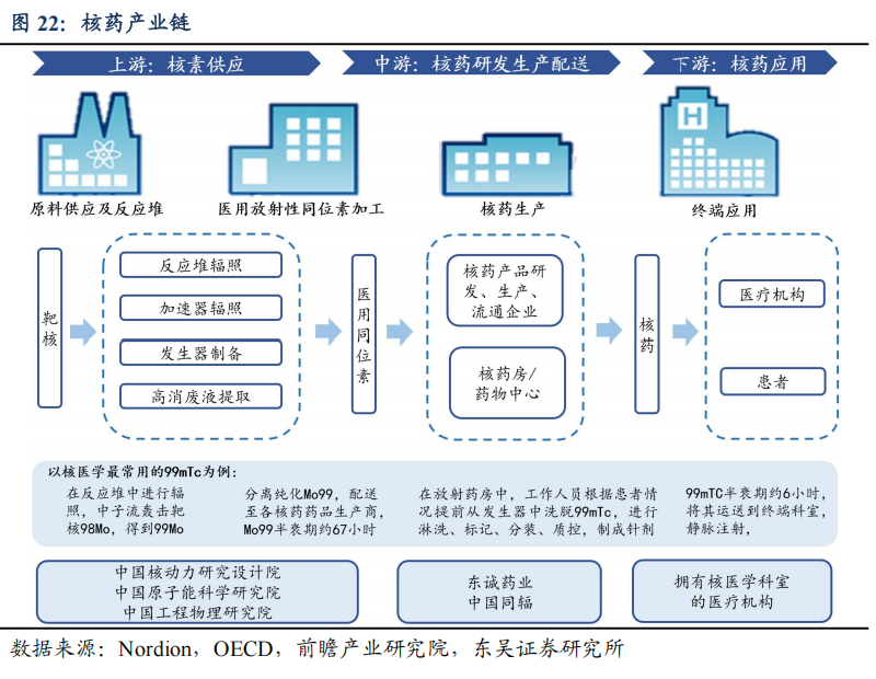 核药产业链较长,且各个环节都具备高度的专业性和壁垒,形成较强的行业壁垒。可将核药产业分为1)上游,通过核反应堆制备、加速器生产及核燃料废液分离提取等渠道制备核素及核原料供应;2)中游,放射性产品研发和生产,以及成品放射性药物的技术研发、临床试验、生产、流通配送等;3)下游,医疗机构对患者的诊断和治疗。