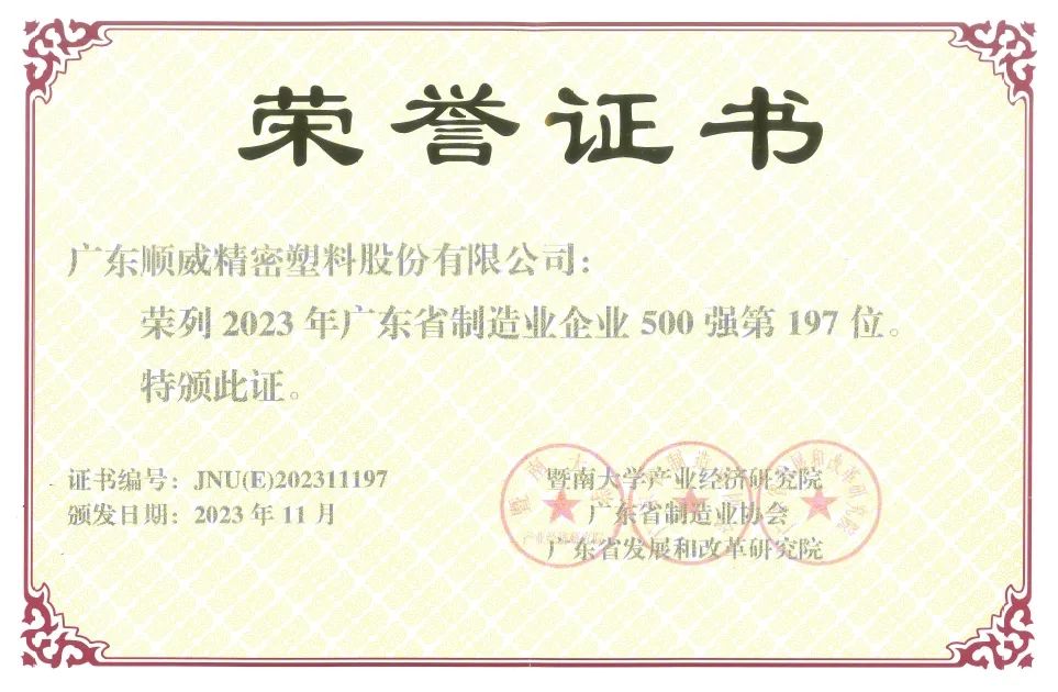 此次入选的500强企业是广东省规模以上制造业的领头羊,带动着整个行业以及产业链的发展,是全省制造业、工业、区域经济乃至整体经济的企稳及持续增长的主力军。顺威股份作为国家高新技术企业,凭借着强大的研发能力、先进的生产制造实力和卓越的产品品质荣登榜单,位列197名。