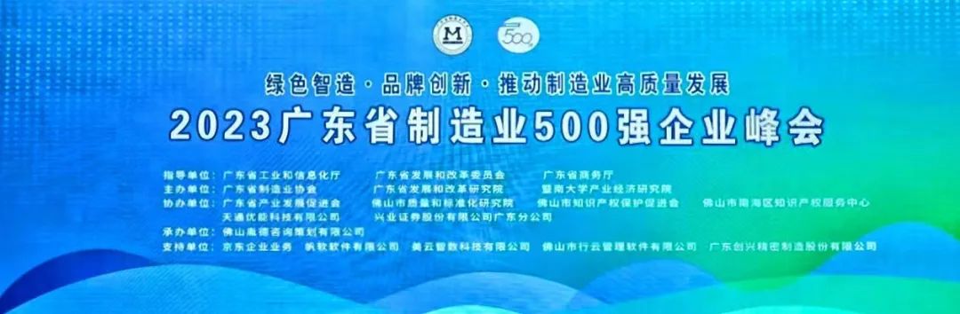 11月21日,以“绿色智造·品牌创新·推动制造业高质量发展”为主题的2023年广东省制造业500强企业峰会在佛山举行。会上揭晓了2023年广东省制造业500强榜单。