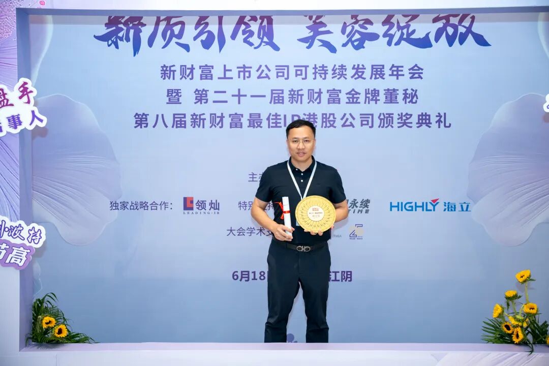 6月18日,“新财富上市公司可持续发展年会暨第二十一届新财富金牌董秘、第八届新财富最佳IR港股公司颁奖典礼”在江阴举行。顺威股份(002676.SZ)副总裁兼董事会秘书蒋卫龙获得“第二十一届新财富金牌董秘”奖项。