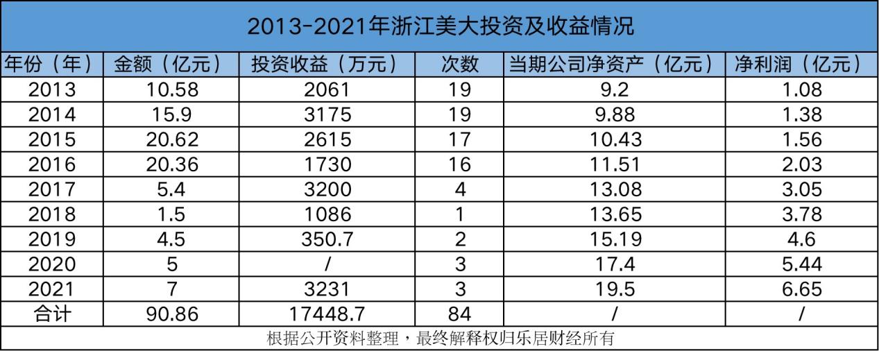利用闲置资金购买理财产品“产品”似乎是浙江美大的惯用操作。公开信息显示,2013年-2021年,浙江美大每年都会拿出一部分自有闲置资金购买理财产品,累计购买理财产品84次,耗资90.86亿元,合作方包括银行、证券公司、信托机构。