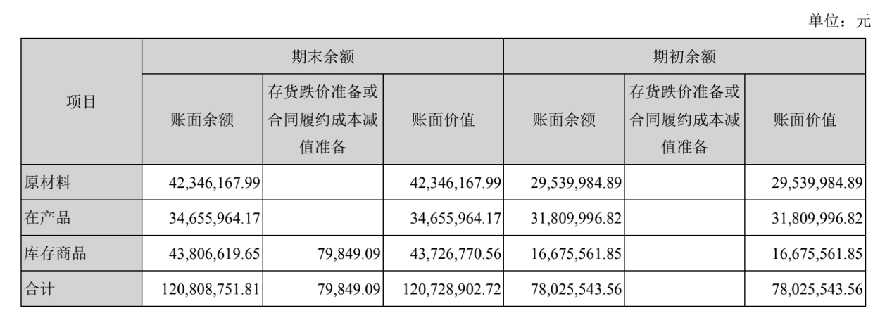 合同负债和其他流动负债合计1.42亿元,同比下降9.41%;在存货方面,账面余额约1.21亿元,占净利润的18%左右,其中原材料账面余额4234.6万元。