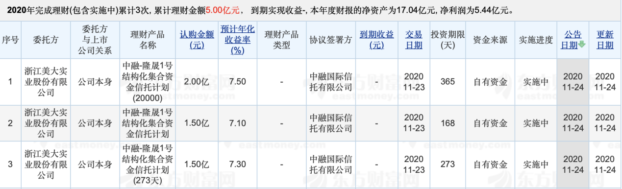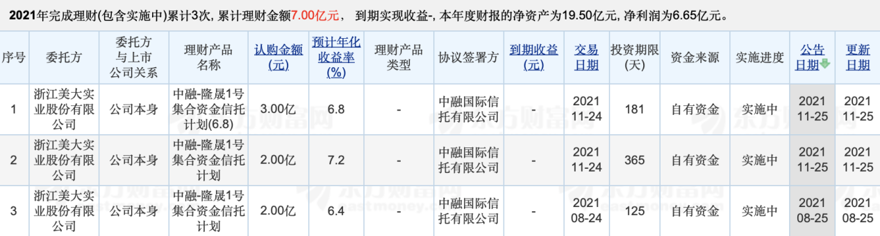 年报显示,在2021年浙江美大实施的3次理财行为中,合作方均为中融国际信托,认购产品均为“中融-隆晟1号集合资金信托计划”,不过有两笔暂未到期。其中2022年05月24日到期预计收益1020万元,2022年11月24日到期预计收益1440万元。