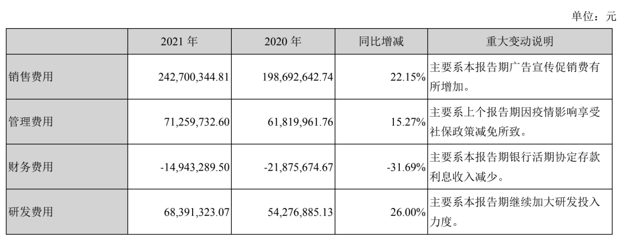 同时,一直花钱偏保守的浙江美大,2021年广告宣传促销费用增幅较大,其销售费用同比增加了22.15%,达2.43亿元;受此影响,其经营活动产生的现金流量净额同比下降2.41%,为6.19亿元。