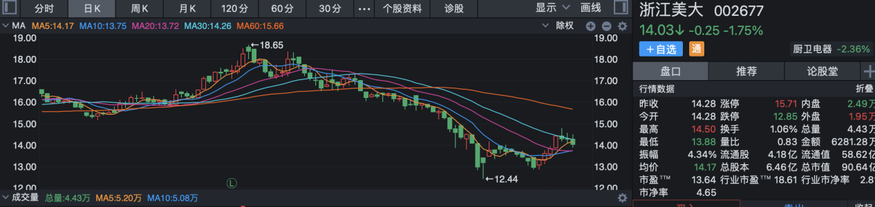 业绩报发布之后,信达证券对浙江美大给出“买入”评级。但却未能实时地传导其股价上,4月11日收盘反而微跌1.75%,报收14.03元/股。