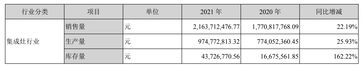 2021年,浙江美大在集成灶业务上实现21.63亿元销售量,同比增长22.19%;9.75亿元生产量,同比增长25.93%;产销率达221.97%。销售规模扩大,导致其库存商品备货量相应加大,库存量同比增涨162.22%。