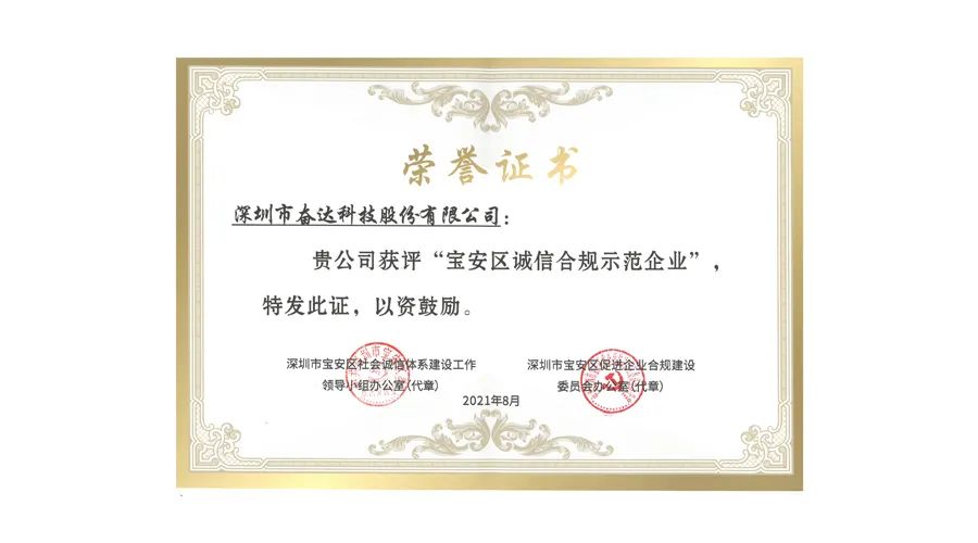 9月9日,宝安区发布首批“3A”信用企业名单及联合激励实施细则,并为宝安区诚信合规示范园区和企业进行授牌。经过自主申报、材料初审、实地考察、专家评审、社会公示等环节综合评定,奋达科技获批“宝安区诚信合规示范企业”及宝安区“3A”信用企业荣誉称号。