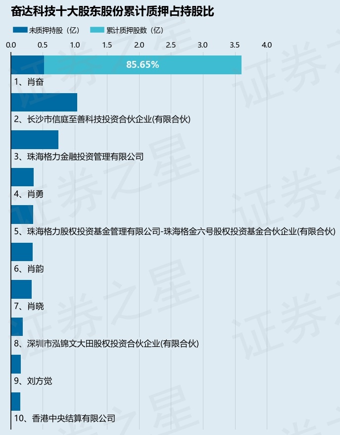 截止本公告日,股东肖奋已累计质押股份3.09亿股,占其持股总数的85.65%。本次质押后奋达科技十大股东的累计质押股份占持股比例见下图: