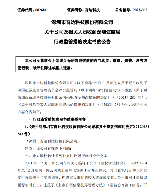 《关于对深圳市奋达科技股份有限公司采取责令整改措施的决定》(〔2023〕 283 号)显示,奋达科技存在未对股权转让系列补充协议履行临时公告义务、未确认 2021 年资产负债表日后调整事项的问题。