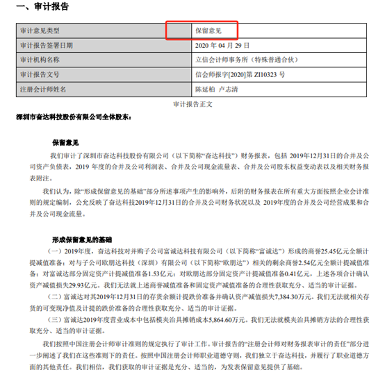 因无法确定奋达科技对商誉减值准备和固定资产减值准备、模夹治具摊销方法等合理性获取充分、适当的审计证据,立信会计事务所对奋达科技2019年财报出具保留意见,同时对内控鉴证报告出具否定意见。