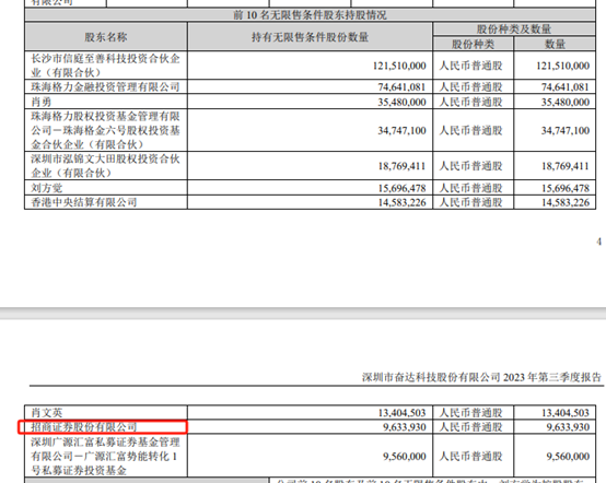 数据显示,招商证券2023年三季度末重仓持股奋达科技,进入公司前十大无限售条件股东名单。