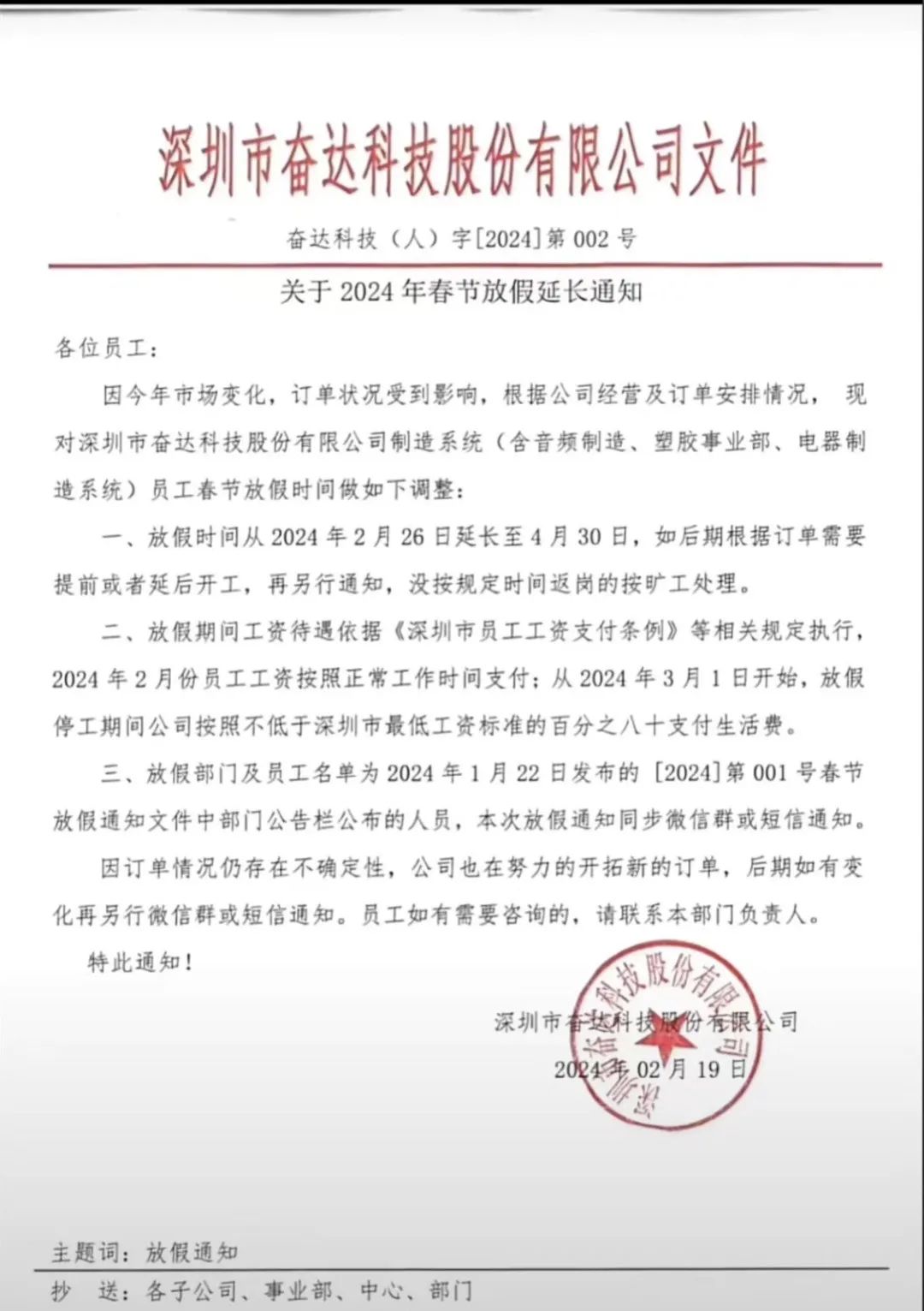 集微网消息近日,近日,一份网络流传的奋达科技延长放假通知显示,因市场变化,订单状况受到影响,公司对部分员工春节放假时间从2月26日延长到4月底,放假期间的工资也将同步调整。