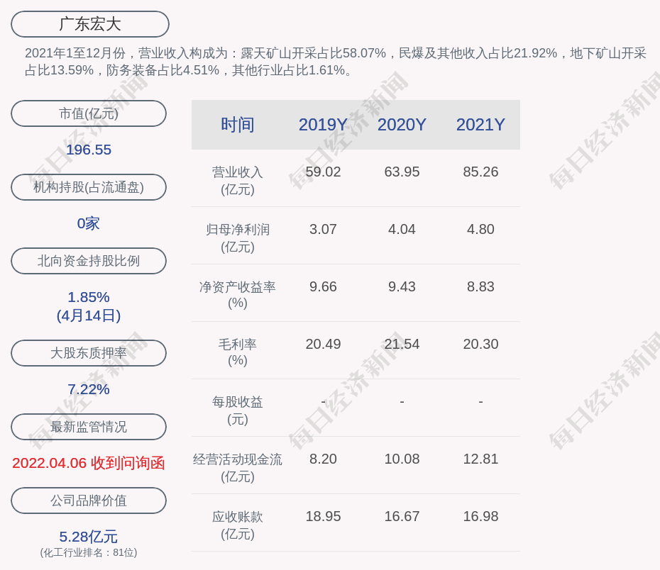 2021年1至12月份,广东宏大的营业收入构成为:露天矿山开采占比58.07%,民爆及其他收入占比21.92%,地下矿山开采占比13.59%,防务装备占比4.51%,其他行业占比1.61%。