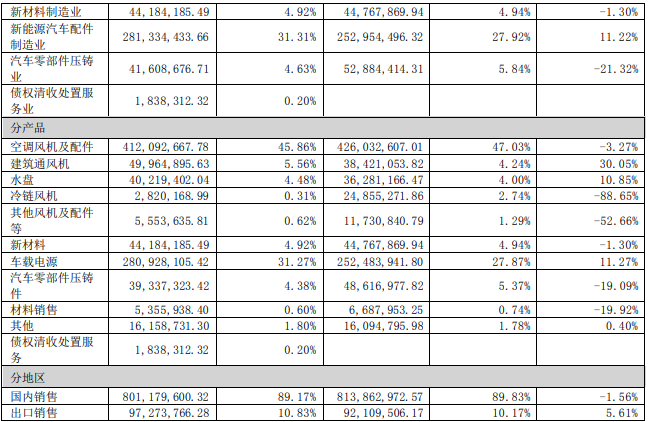 空调风机及配件对总营收贡献最大,占45.86%,出口销售业绩同比增长5.61%