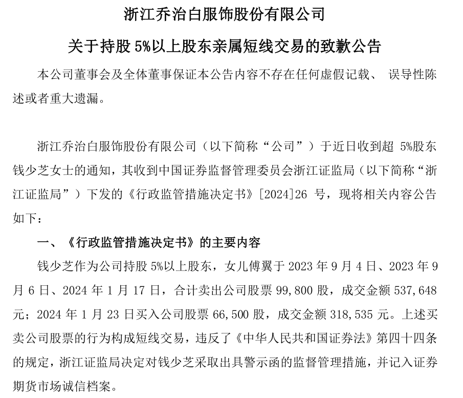 2月29日晚间,浙江乔治白服饰股份有限公司发布关于持股5%以上股东亲属短线交易的致歉公告。