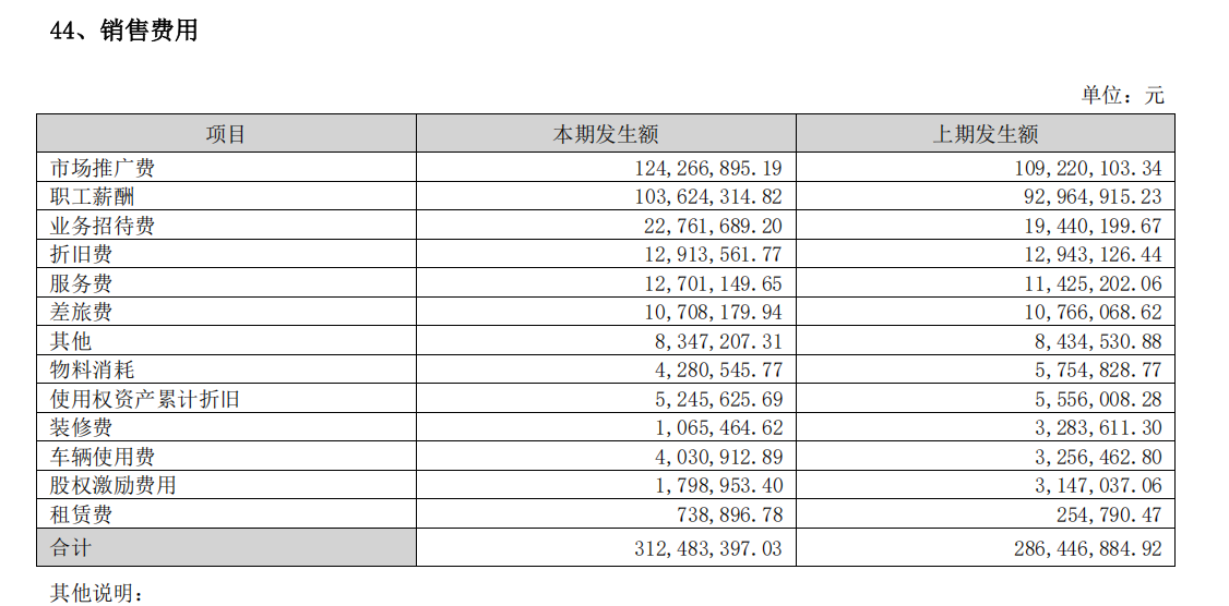 值得注意的是,虽然前五大客户销售额以及营收下滑,但乔治白的销售费用仍在增长。年报数据显示,期内,公司销售费用为3.12亿元,较2023年同期上涨9.09%。具体来看,销售费用中增长最多的为“市场推广费”,较2023年增加了约1505万元。此外,职工薪酬、业务招待费也有明显增长。