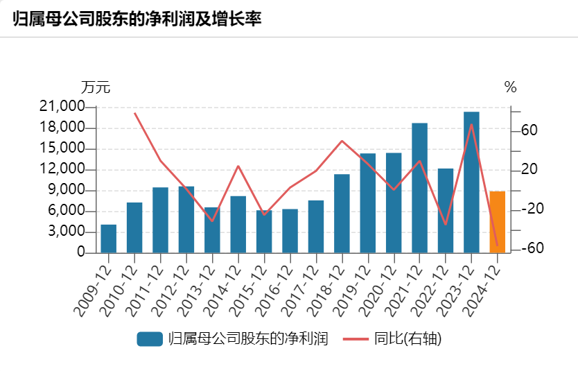 回顾乔治白过往多年财报可以发现,该公司自2018年起每年的归母净利润便已迈上亿元台阶,其中2023年更是达到2.03亿元,2024年为近七年来最差水平。与此同时,高达56.51%的同比降幅更是一举刷新了自 2012年上市以来的纪录。