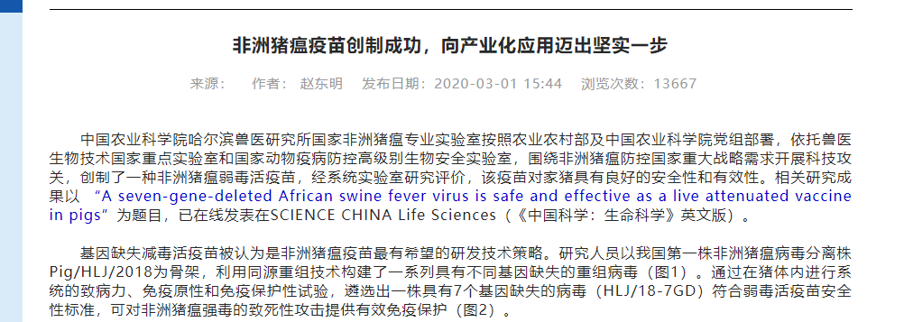 在研究研制非洲猪瘟疫苗上,中国农业科学院哈尔滨兽医研究所(以下简称哈兽研)走在前列。2020年3月,哈兽研官网发布《非洲猪瘟疫苗创制成功,向产业化应用迈出坚实一步》文章。文章中称,哈兽研创制了一种非洲猪瘟弱毒活疫苗,经系统实验室研究评价,该疫苗对家猪具有良好的安全性和有效性;并称基因缺失减毒活疫苗被认为是非洲猪瘟疫苗最有希望的研发技术策略。