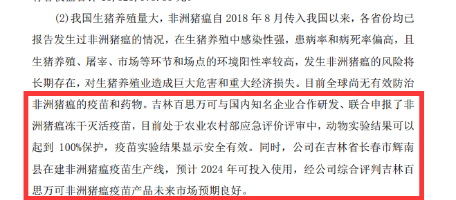 上市公司特别指出,我国生猪养殖量大,非洲猪瘟自2018年8月传入我国以来,各省份均已报告发生过非洲猪瘟的情况,在生猪养殖中感染性强,患病率和病死率偏高,且生猪养殖、屠宰、市场等环节和场点的环境阳性率较高,发生非洲猪瘟的风险将长期存在,对生猪养殖业造成巨大危害和重大经济损失。目前全球尚无有效防治非洲猪瘟的疫苗和药物。