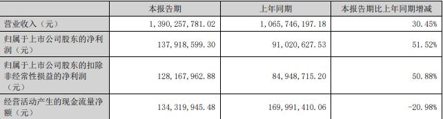 据公司2025年半年报,报告期内,公司实现营业收入13.90亿元,同比增长30.45%;归属于上市公司股东的净利润1.38亿元,同比增长51.52%;扣除非经常性损益后的净利润1.28亿元,同比增长50.88%;经营活动产生的现金流量净额1.34亿元,同比减少20.98%。
