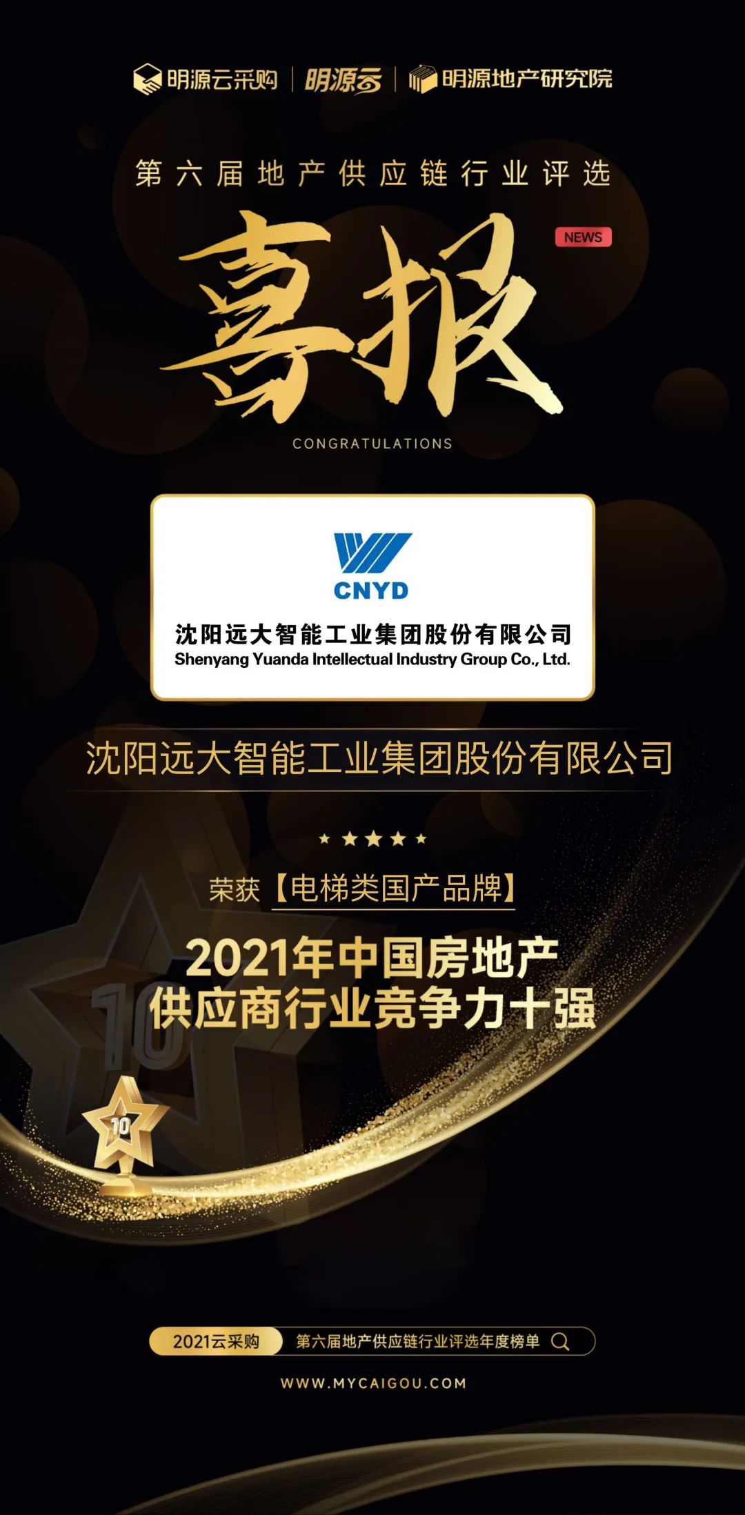 2022年2月24日由明源云采购主办第六届地产供应链行业评选榜单重磅揭晓,沈阳远大智能博林特电梯荣获电梯行业中国房地产竞争力十强供应商。