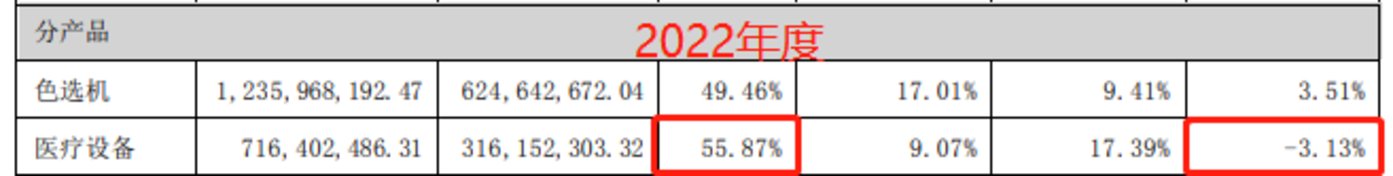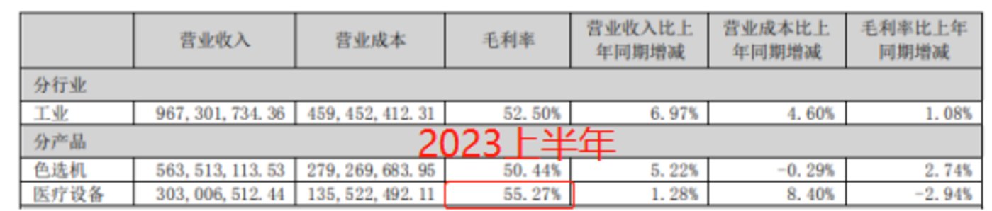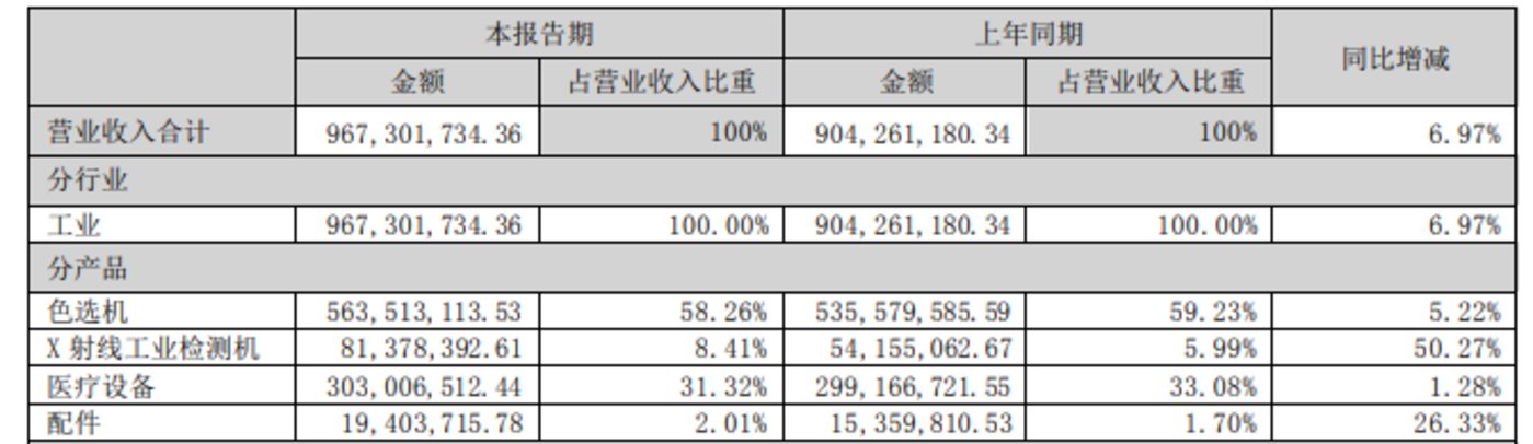 分产品来看,今年上半年美亚光电各类产品收入均有不同程度增长。作为基石业务,色选机实现收入5.64亿元,同比增长5.22%。医疗设备作为第二大收入来源,实现营收3.03亿元,同比微增1.28%。