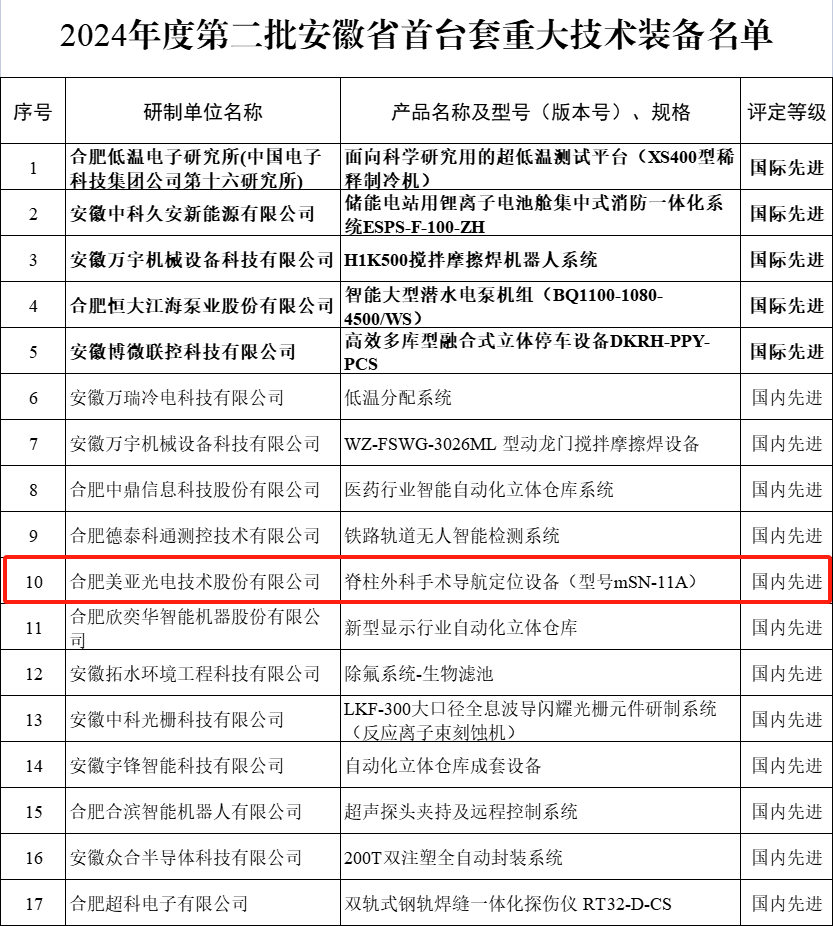 近日,安徽省工业和信息化厅公布2024年度第二批安徽省首台套重大技术装备名单。美亚光电脊柱外科手术导航定位设备成功入选,评定等级为国内先进。这是公司继X射线检查系统(安检机)、三维数字化口腔CT、X射线轮胎检测设备之后,又一最新入选的首台套产品。