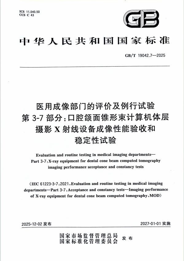 该标准首次在国家标准层面,为口腔颌面锥形束计算机体层摄影设备(以下简称“口腔CBCT”)建立了系统、科学的性能评价体系。其全面规范了口腔CBCT设备在验收和稳定性试验中的技术要求,聚焦影响诊断准确性与患者安全的关键技术指标,明确规定了空间分辨率、对比度噪声比、均匀性、几何精度、伪影评估等核心性能参数,同时对设备的辐射安全和图像质量提出了明确要求,助力实现从生产到应用的全流程标准化管理。