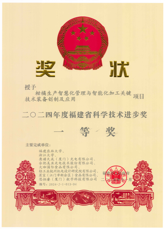日前,《福建省人民政府关于2024年度省科学技术奖励的决定》正式公布,美亚光电参与的《柑橘生产智慧化管理与智能化加工关键技术装备创制及应用》荣获福建省科技进步奖一等奖。