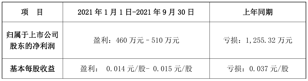 挖贝网10月14日,冀凯股份(002691)近日发布2021年前三季度业绩预告公告,预计2021年前三季度实现归属于上市公司股东的净利润为460万元–510万元,同比扭亏为盈。