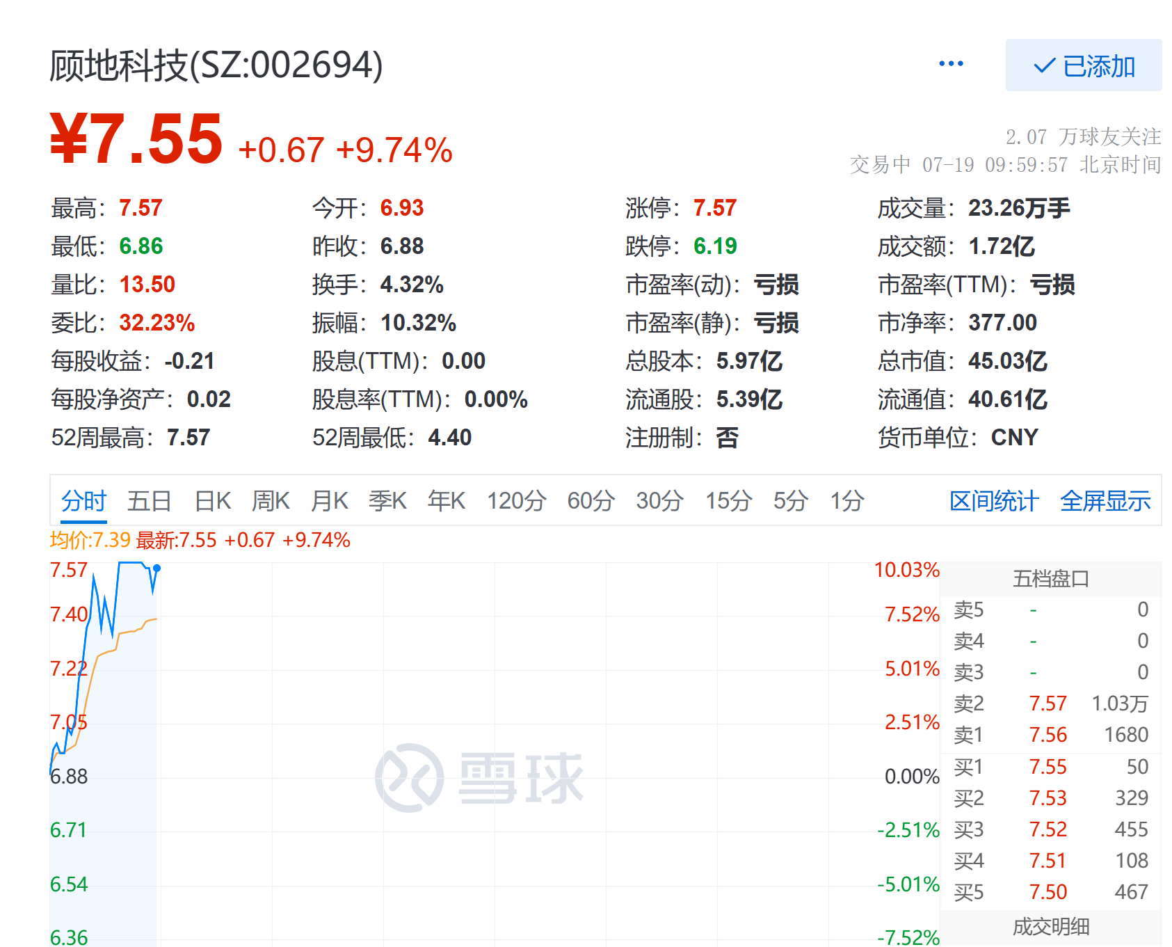 乐居财经彦杰7月19日,截至发稿时,顾地科技逼近涨停,现报7.55元每股。总市值45.03亿元。