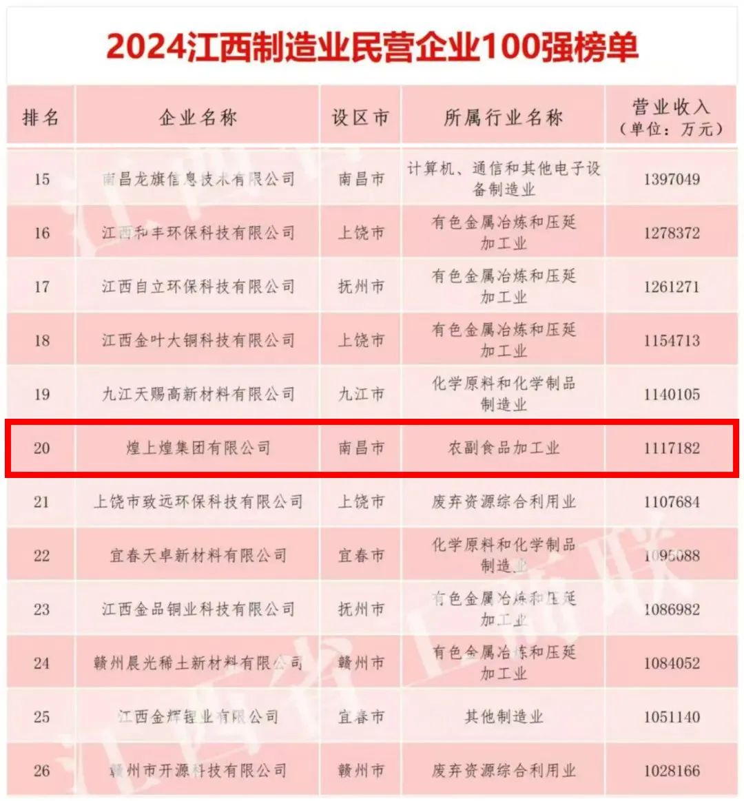 11月11日,由江西省人民政府新闻办、江西省工商业联合会、江西省地方金融管理局主办的2024江西民营企业100强发布会在南昌举行。会上发布了2024江西民营企业100强、制造业民营企业100强、服务业民营企业20强榜单,煌上煌集团再次荣登“江西民营企业100强”、“江西制造业民营企业100强”榜单。