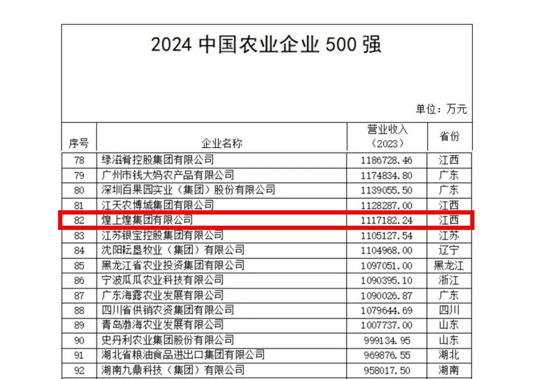 12月11日,农民日报社发布2024中国农业企业500强榜单。榜单聚集发布粮油、畜牧、奶业、水产、食品、流通、农资等领域头部企业,煌上煌集团有限公司再次荣誉登榜,同时入选中国农业企业食品行业20强。