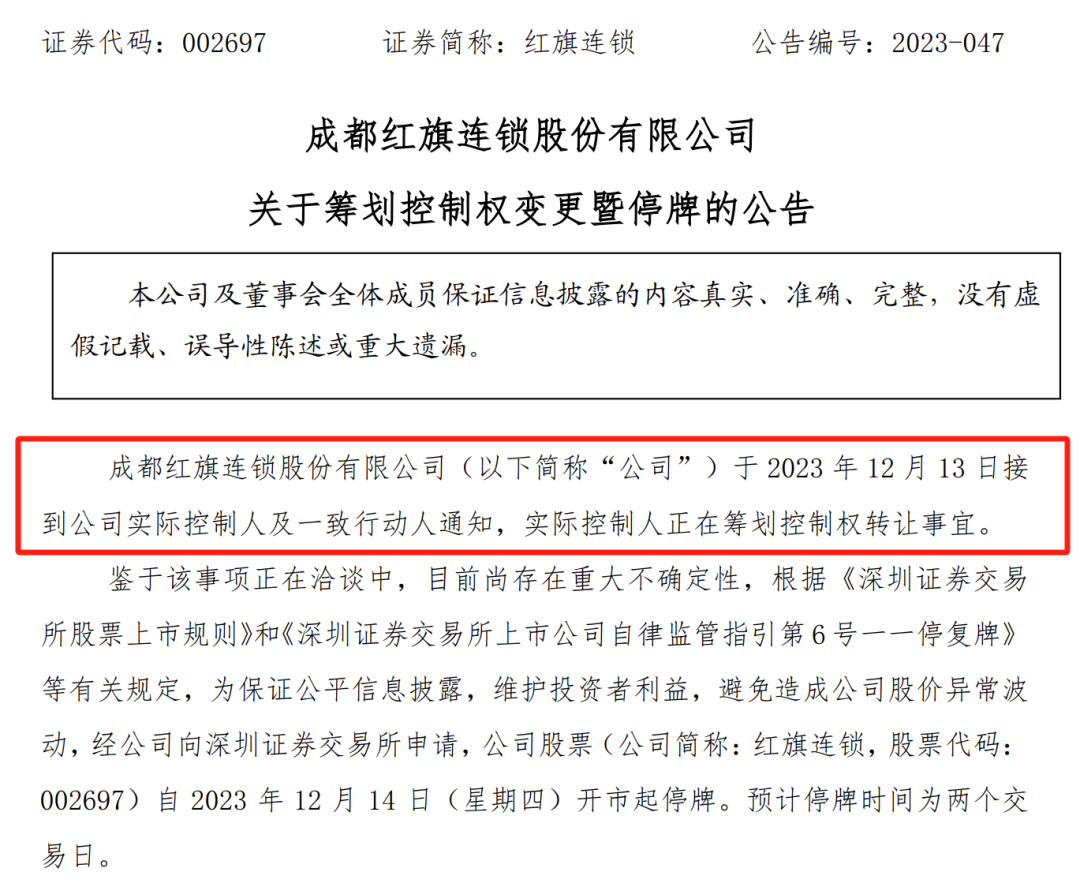 12月13日晚间,红旗连锁发布公告称,接到公司实际控制人及一致行动人通知,正在筹划控制权转让事宜。鉴于该事项正在洽谈中,目前尚存在重大不确定性,为避免造成公司股价异常波动,红旗连锁股票自12月14日(星期四)开市起停牌,预计停牌时间为两个交易日。