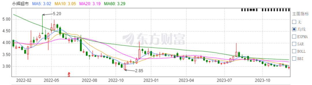 作为曾经的大白马,永辉超市这2年活得似乎有点憋屈,这从下图的股价走势里可以窥见一二。