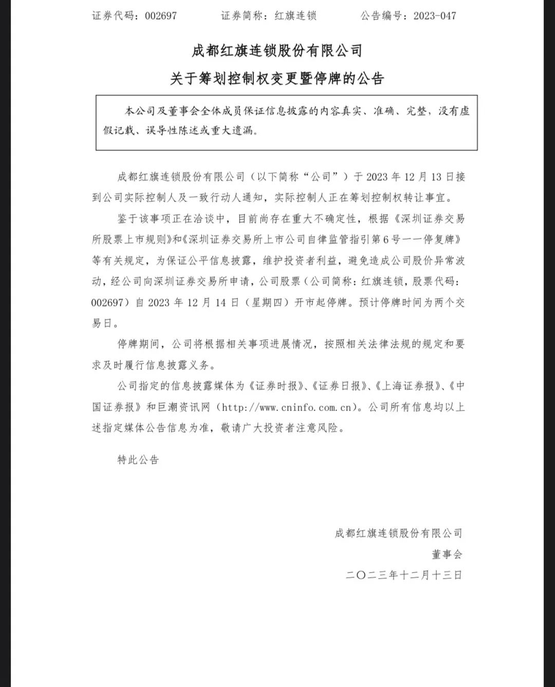 值得一提的是,12月7日,红旗连锁发布“关于转让自有房产的公告”,公告显示,红旗连锁拟将位于成都市温江区公平和平街221号房产出售给成都黄大姐保洁服务有限公司,经双方协商,最终确定转让总价款为2000万元。