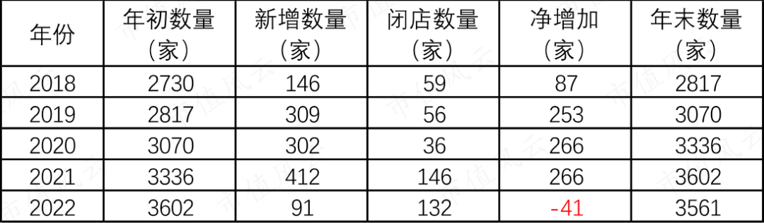 不过2022年不再增长,反而比2021年少了41家。2023年上半年门店数量为3592家,略微增加。