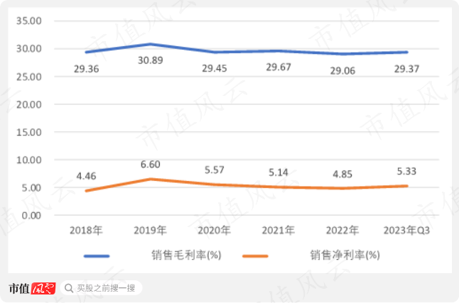 红旗连锁毛利率只有30%左右,净利率在5%-6%左右。