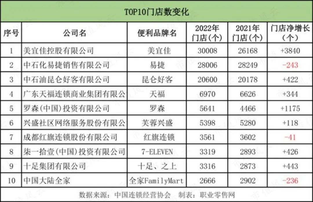 根据中国连锁经营协会(CCFA)的资料,2022中国便利店TOP 10公示中,美宜佳排第1,易捷排第2,红旗连锁排第7。