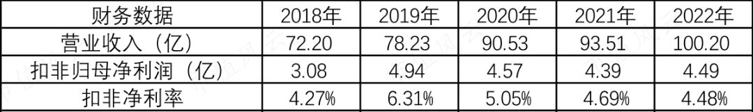 考虑到红旗连锁还有一定的政府补助,扣非净利率会更低,比如2022年,红旗连锁营业收入为100.2亿,扣非归母净利润为4.49亿,扣非净利率只有4.48%。
