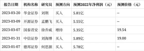 2023年3月20日,博实股份新增1家机构对其2022年度业绩做出预测。6个月内累计共5家机构,预测2022年净利润均值为5.68亿元,较去年同比增长15.76%。其中,4家机构“买入”,1家机构“增持”。目标价格最高预测19.54元,最低预测19.00元,平均为19.27元。