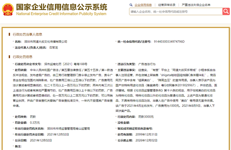 12月10日讯据国家企业信用信息公示系统,近日,深圳市同道大叔文化传播有限公司因广告违法行为,被深圳市市场监督管理局南山监管局罚款3000元。