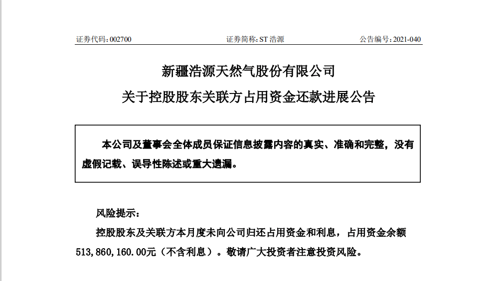 7月31日,新疆浩源天然气股份有限公司(002700)发布《关于控股股东关联方占用资金还款进展公告》,2021 年 7 月,控股股东处置个人资产和融资等方式筹措资金还在办理过程中,本月度未向公司归还占用资金和利息,截止 2021 年 7 月末,控股股东及关联方占用公司资金余额 513,860,160.00 元(不含利息)。