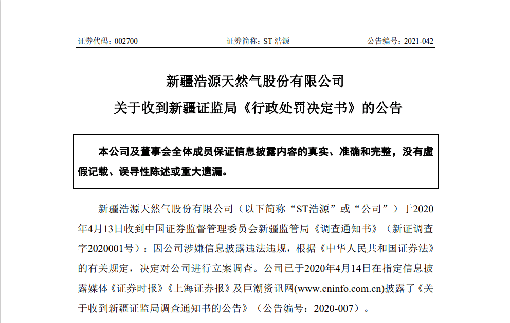 8月3日晚,新疆浩源天然气股份有限公司(002700)公告,公司及相关人员收到新疆证监局下发的《行政处罚决定书》([2021]4号)。经查明,ST浩源存在未按规定披露其为关联人提供 8000 万元担保及因担保责任产生的 6007.5079 万元资金占用的事项,以及未按规定披露关联方非经营性占用资金的关联交易事项。