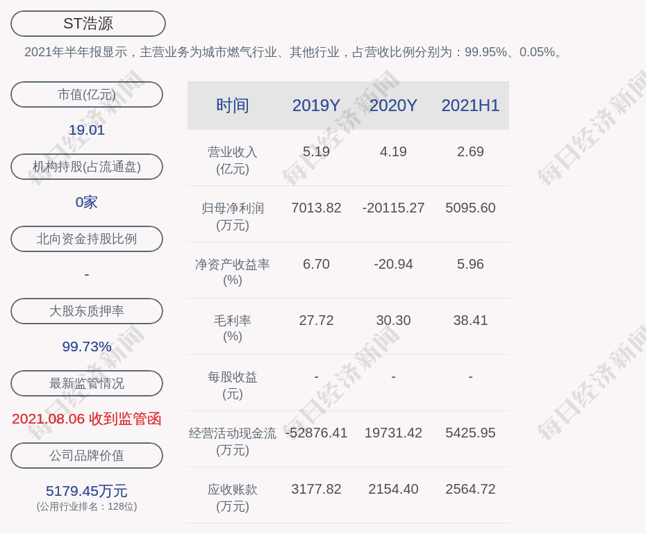 2021年半年报显示,ST浩源的主营业务为城市燃气行业、其他行业,占营收比例分别为:99.95%、0.05%。