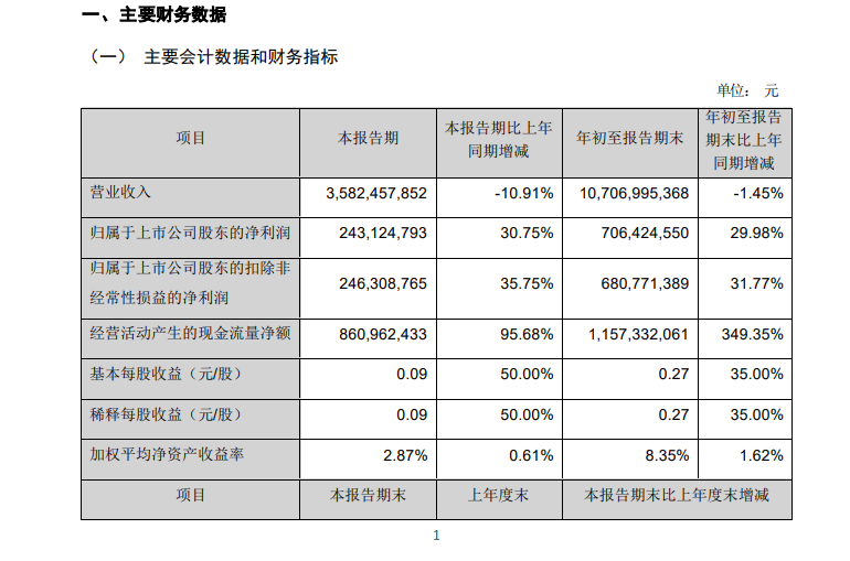 10月31日发布三季度业绩公告称,2023年前三季度营收约107.07亿元,同比减少1.45%;归属于上市公司股东的净利润约7.06亿元,同比增加29.98%;基本每股收益0.27元,同比增加35%。