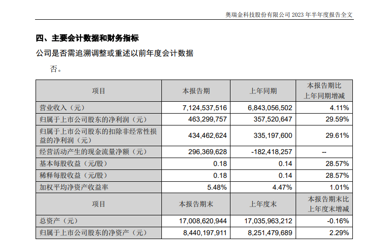 半年报显示,该公司今年1月-6月实现营业收入71.25亿元,同比增长4.11%;实现归属于上市公司股东的净利润4.63亿元,较上年同期增长29.59%;扣非净利润4.34亿元,同比增长29.61%;基本每股收益0.18元/股,较上年同期增长28.57%。