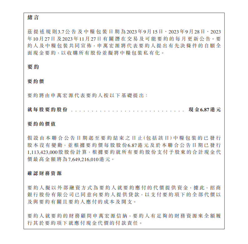 此外值得关注的是,中粮包装亦于2023年12月6日发布公告称,长平实业全资子公司CHAMPION HOLDING (BVI) CO., LTD(长平实业直接全资拥有)提出有先决条件的自愿全面现金要约,以收购中粮包装所有股份并拟以每股6.87港元现金收购所有中粮包装股份将其私有化,其后将其退市。私有化现金代价最高约76.49亿港元。