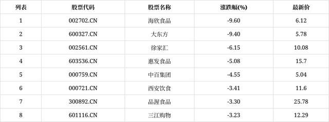 今日早盘,截至09:45,社区团购板块下挫。海欣食品(002702.CN)跌9.60%报6.12元,大东方(600327.CN)跌9.40%报5.78元,徐家汇(002561.CN)跌6.15%报10.08元,惠发食品(603536.CN)跌5.08%报15.7元,中百集团(000759.CN)跌4.55%报5.04元,西安饮食(000721.CN)跌3.41%报11.6元,品渥食品(300892.CN)跌3.30%报25.78元,三江购物(601116.CN)跌3.23%报12.29元。