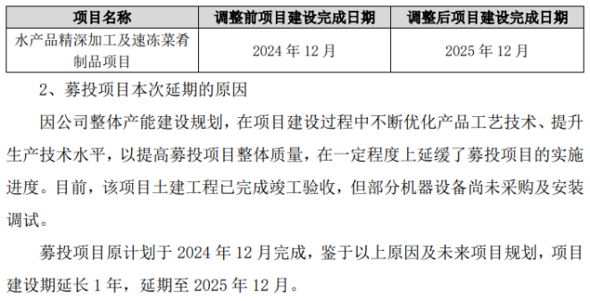 值得关注的是,公司曾于2022年10月推出定增预案,计划募资不超过5.2亿元用于“水产品精深加工及速冻菜肴制品项目”,彼时公司称,现有产能已无法满足市场需求增长,产能不足制约了规模扩张。该项目原计划2024年12月完工,达产后将新增2.5万吨速冻菜肴制品、7.5万吨鱼糜/肉制品及2000吨大豆拉丝蛋白产能。